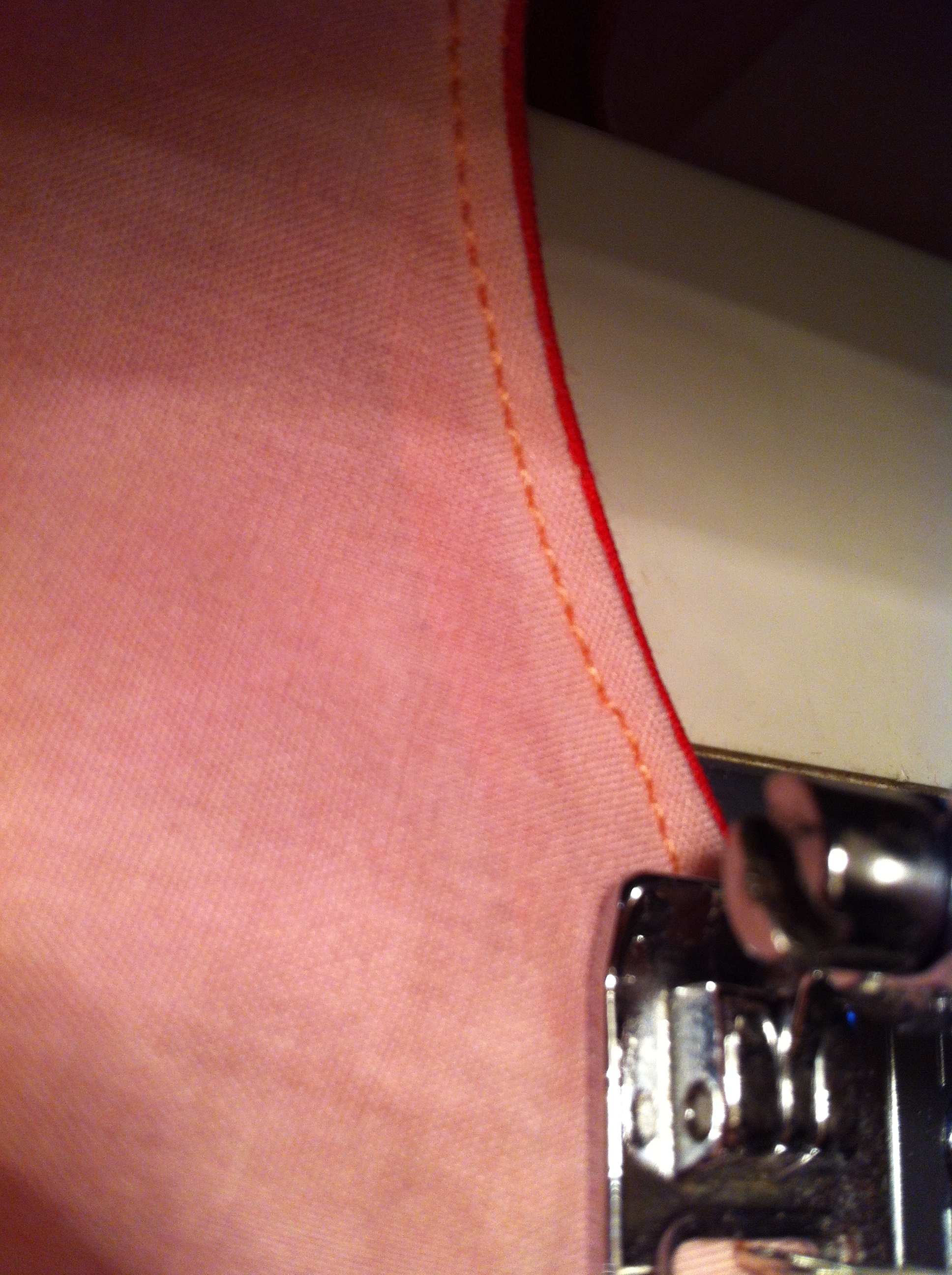 Turn everything right side out through that hole you left. Next top stitch along the edges of the entire dress to give it a finished look. As you top stitch, you will close up that hole you left.