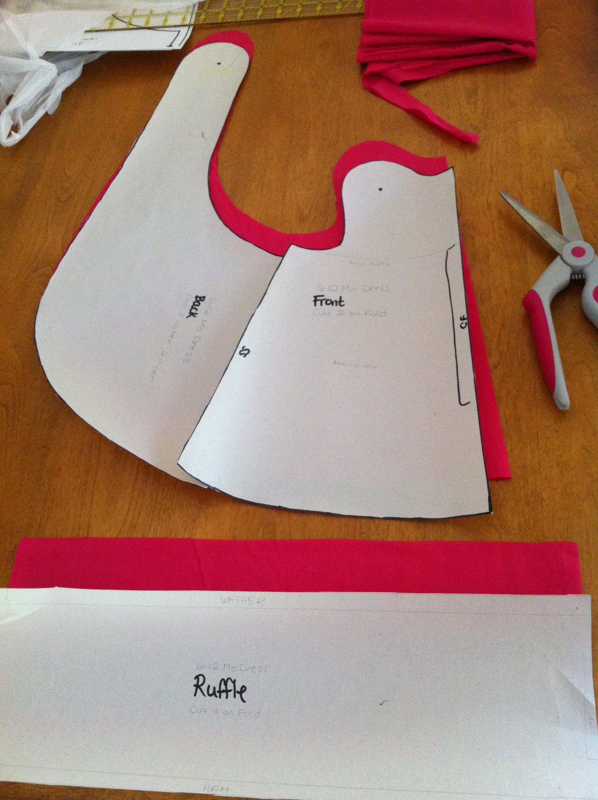 I made the pattern and am working on scanning it in to make available to print. It is a very simple pattern to use. The pattern already has a .5″ seam allowance so keep that in mind when cutting. The pattern includes: front (A), back (B), and ruffle (C) which is optional. I think it came out a bit bigger than I would like, so I would say this is a 12-18 month size. It fits like a dress on my 12 month old and will hopefully still fit as a top next year. So she will get a lot of use out of it. Which makes mama happy.