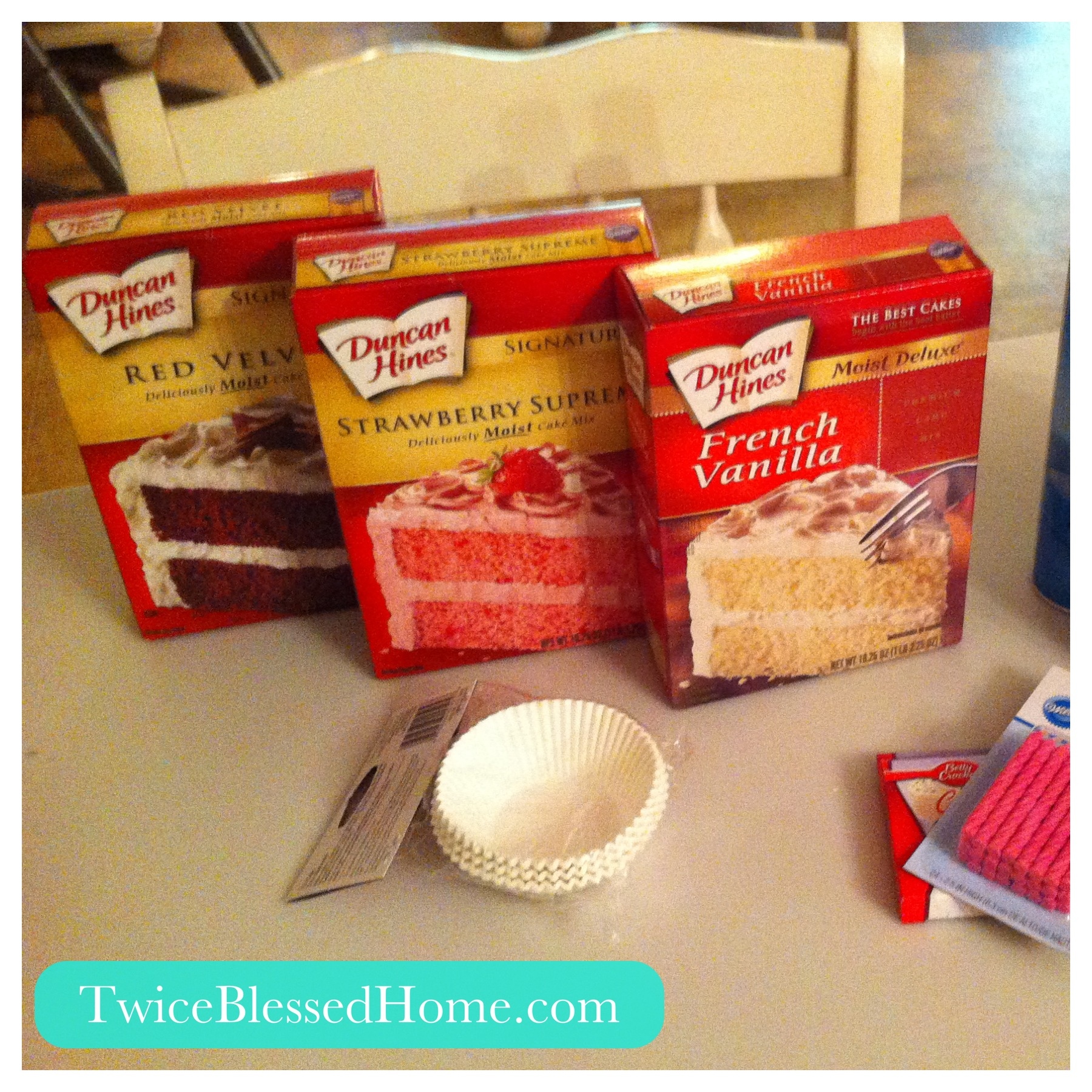 But time runs out and you find yourself 48 hours before the party and a million things to do. So I was forced to leave Pinterest world and come back to reality. I then came up with a brilliant idea of mixing cake box mixes instead! I bought 3 Duncan Hines cake mixes: Red Velvet, Strawberry Supreme, and French Vanilla. And they actually taste good together or this idea would not have turned out so brilliant.