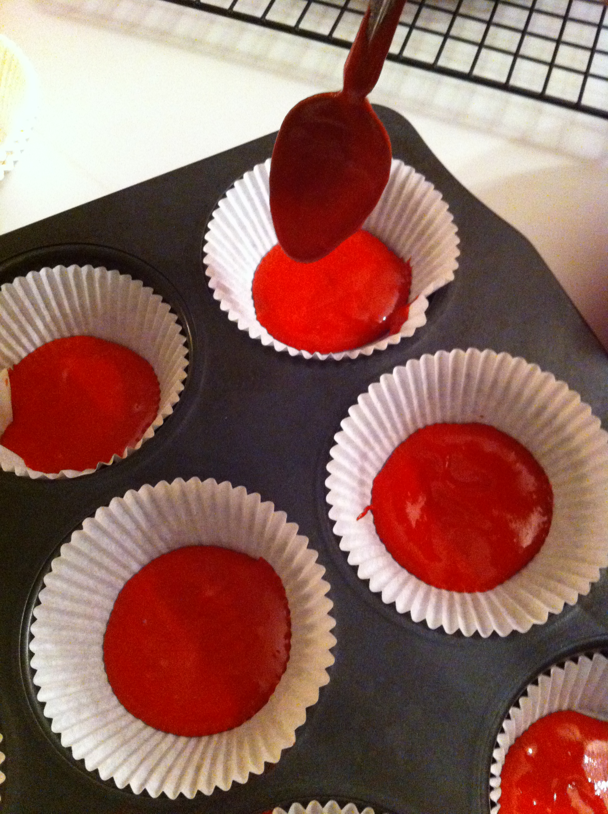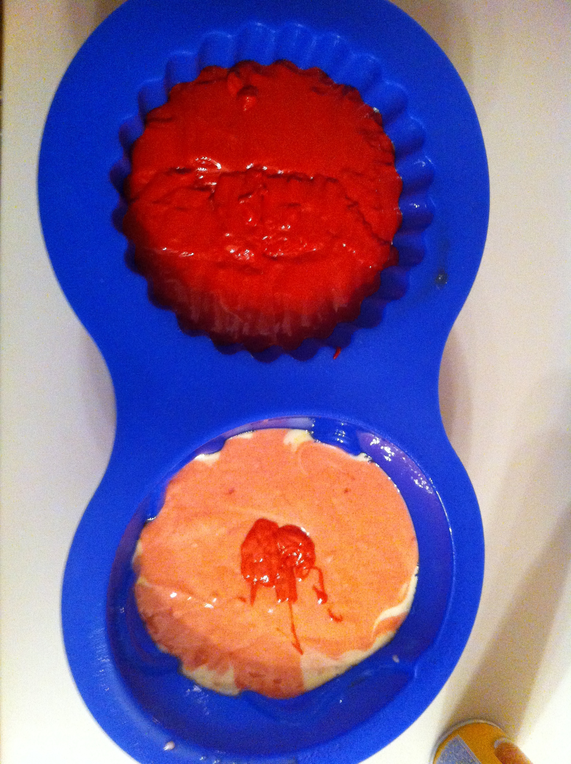 I only needed 24 cupcakes and if you do the math 3 cake boxes means you’re left with lots of batter. I poured the rest in layers into a giant cupcake pan.