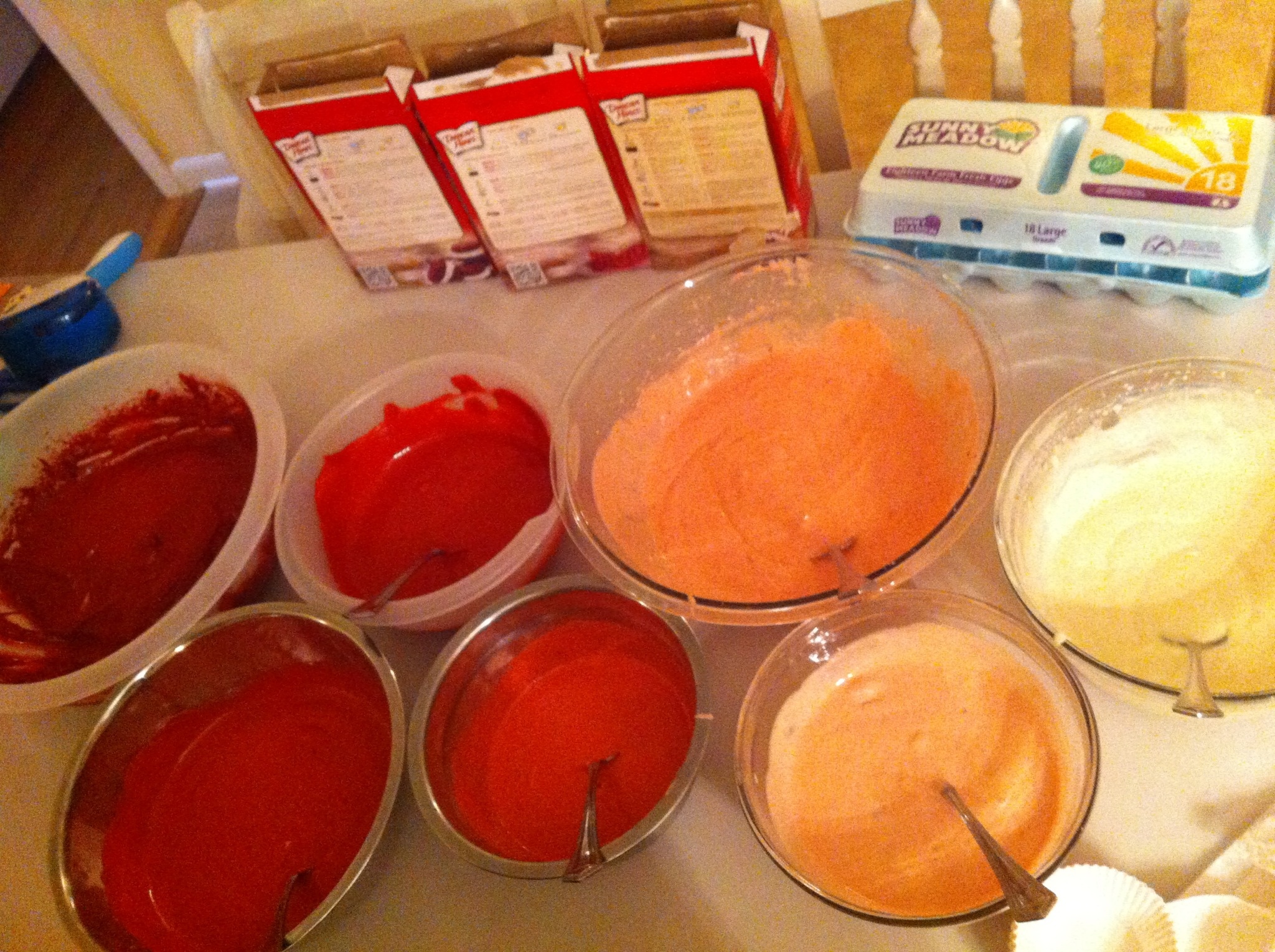 I first mixed up each cake mix separately. Then I just started playing around with the colors. Which is a very yummy adventure. I quickly found that the red velvet will turn everything red so you dont need much of it when experimenting.