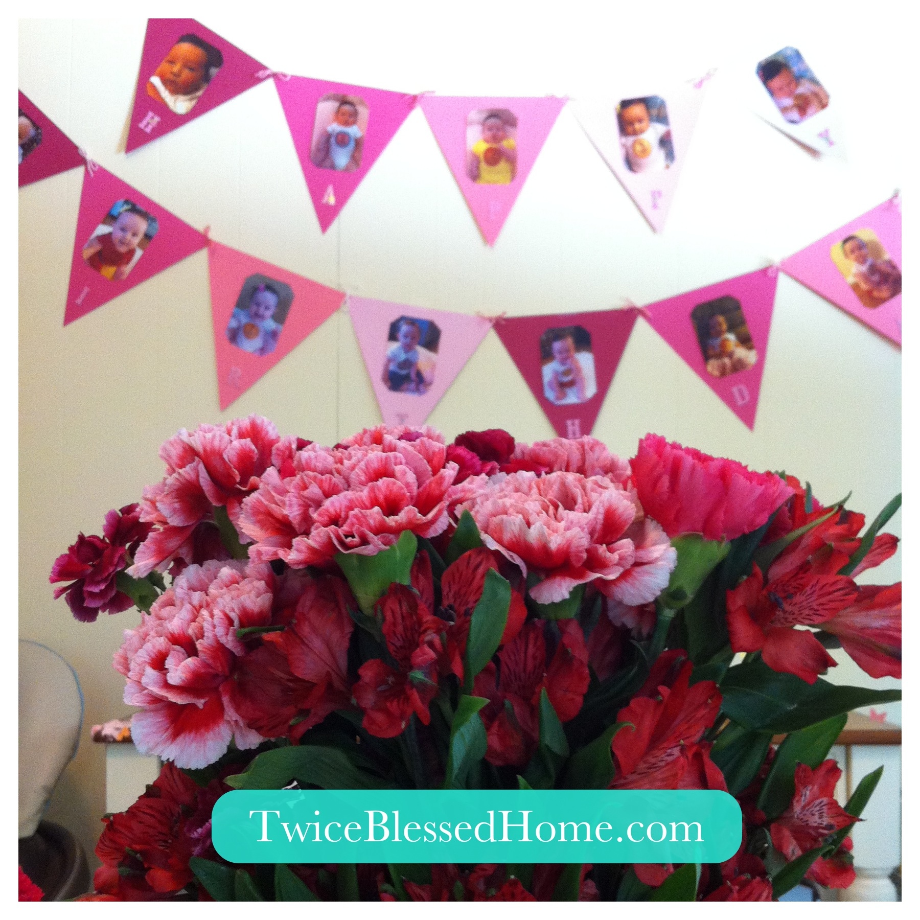 I decided to make a banner out of the photos. I used different shades of pink paper to give an ombre effect and used her 0-12 month photos and then added the letters to spell Happy Birthday. It turned out cute and was super simple. Not sure why this pic turned out so blurry. Sorry. Need. New. Camera.