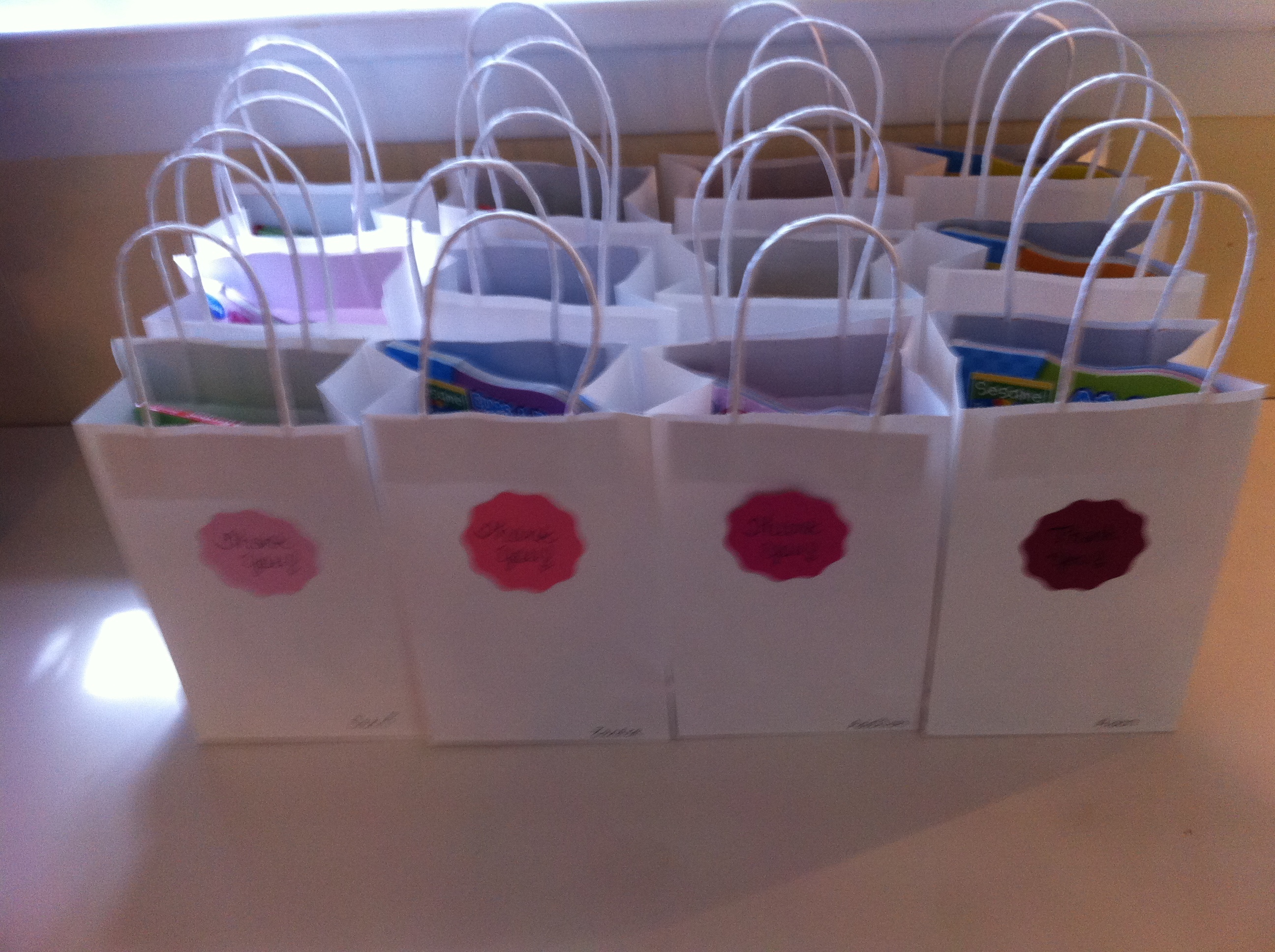 I found a pack of white bags at Joanns and made thank you labels for their parting gifts. Each bag included a small book and crackers.