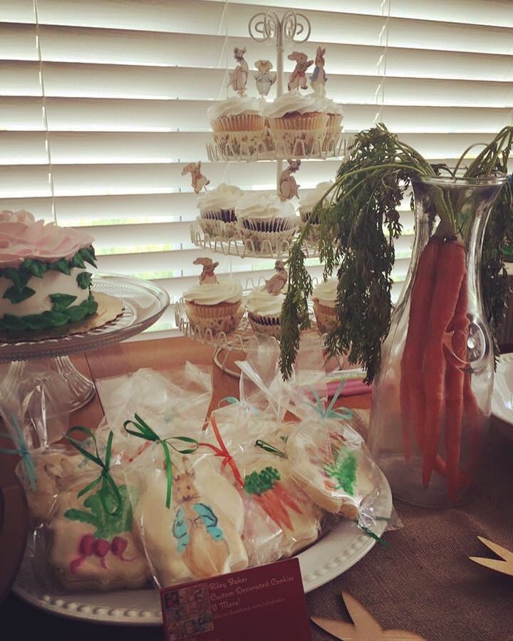 My 2nd and 3rd babies celebrate their birthdays only a few weeks apart in the summer. I knew I wanted a Peter Rabbit party for my baby Benjamin. My daughter was turning four and obsessed with the Peter Rabbit cartoon and story book. So we decided to combine their birthdays! And it worked out great! Again I went to Etsy to find inspiration. I found a vintage birthday banner from the original drawings and a sweet baby bib. I found all the decor and paper goods from Meri Meri party supplies. I knew the rest would come together with the food. I ordered two small cakes from Publix and asked them to make them to look like flowers. My friend made her fabulous cookies again. Then I had fun deciding on “garden theme” food. Family helped me prep the food. The kiddies munched on veggies and sweets and played pin the tail on the bunny. It is still my favorite party yet! I only wish I had a better camera back then. Click each pic to zoom in.
