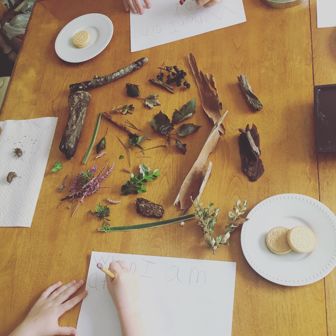 3. Nature study: spread out and discuss their findings, and draw three items. When finished, we put everything in our “August jar”. I want them to see how life changes through the seasons. We will also be studying and drawing from a stack of nature books. π