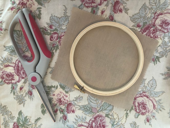 First cut a square piece of fabric that will fit your embroidery hoop. I used linen and cut a 7.5″ x 7.5″ square (my hoop is 6″).
