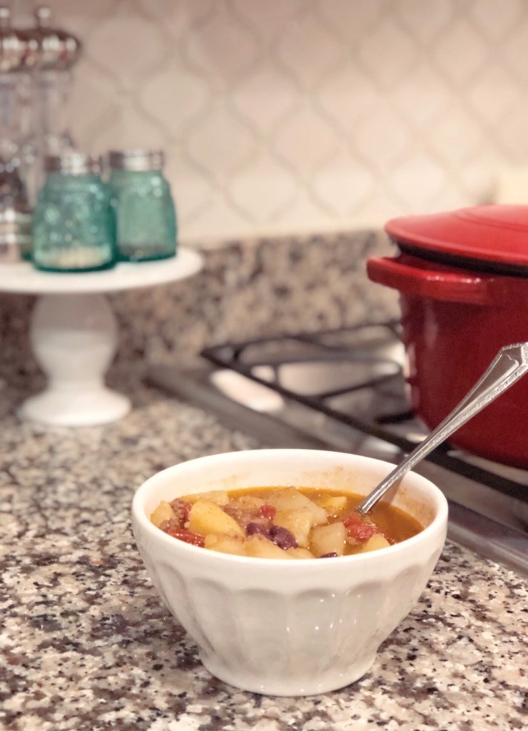 We had our first real snow day this week! We love soup on a snowy day. I came up with this recipe over the holidays. I call it “chili stew” aka “what’s left in the pantry and deep freezer”. I was pleasantly surprised with how it turned out. And all of my kids loved the flavor. This “meat and potatoes” recipe is a great comfort food after a cold day. Frosty approves.