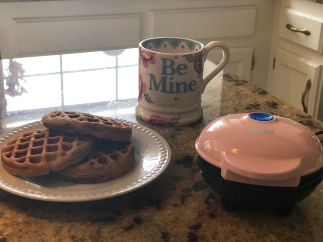 For Valentines Day, I bought the kids a mini waffle maker! We made some semi-homemade waffles inspired by the Paleo Waffles Nesting With Grace posted on her blog. I had some Gluten Free Pancake Mix from Trader Joe’s on hand so we subbed it in for the dry ingredients. The recipe on the box only makes 2 waffles! By adding a few more ingredients, we get 10 waffles instead of 2 and a lot more flavor and protein!